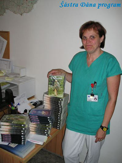 Velmi ochotná paní Drdová z oddělení transfůze, která bude ráda předávat tyto knihy jejich největším dárcům krve jako odměnu a možná je také bude zvát do naší restaurace Góvinda.