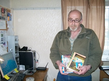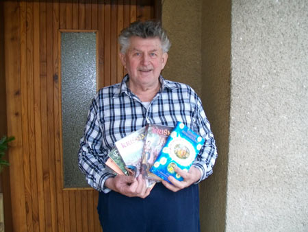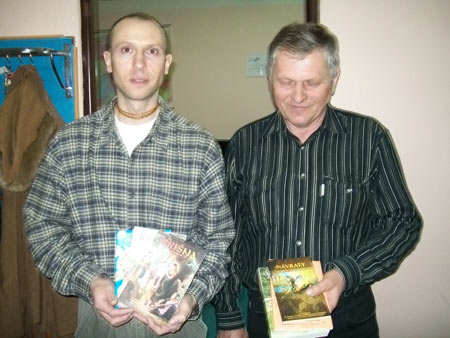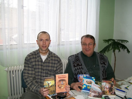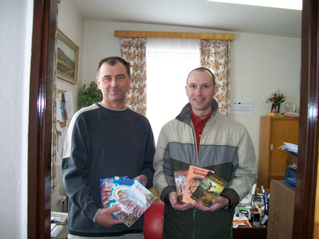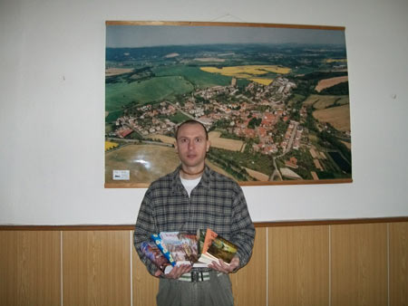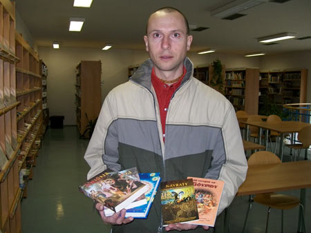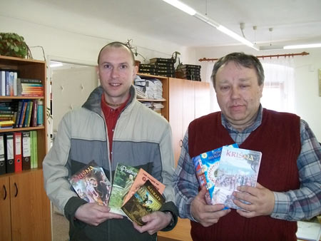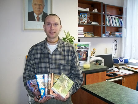 Místní knihovna Keblov, věnováno 7 knih. Na fotografii starosta obce, který nedávno znovu obnovil funkčnost knihovny jako službu občanům jejich obce.