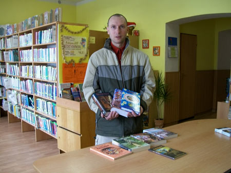Místní knihovna Poříčí nad Sázavou, 130 čtenářů, věnováno 8 knih. Knihy přebírá s vděkem mladý starosta obce.